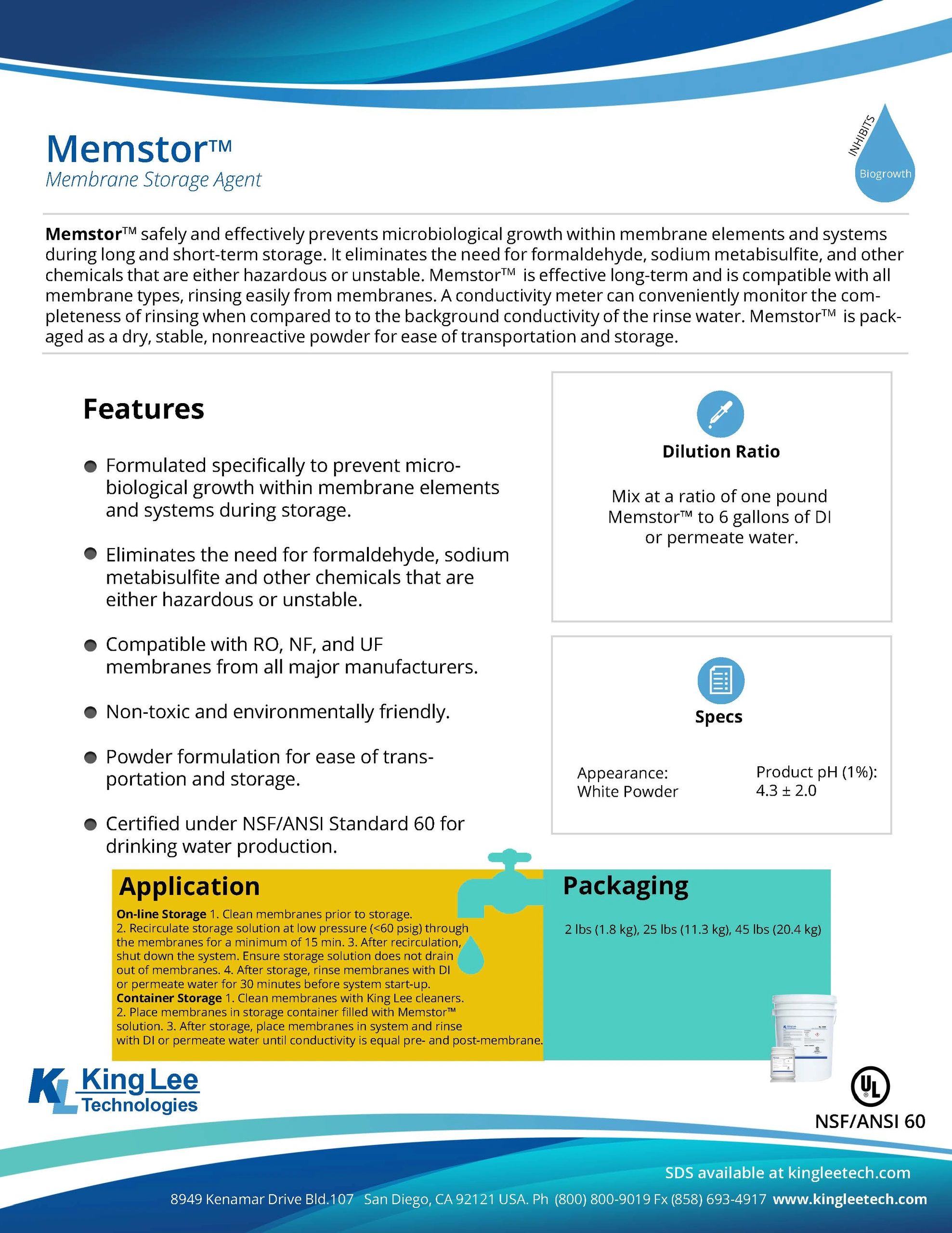 MemstorTM safely and effectively prevents microbiological growth within membrane elements and systems during long and short-term storage. It eliminates the need for formaldehyde, sodium metabisulfite, and other chemicals that are either hazardous or unstable. MemstorTM is effective long-term and is compatible with all membrane types, rinsing easily from membranes. A conductivity meter can conveniently monitor the completeness of rinsing when compared to to the background conductivity of the rinse water. MemstorTM is packaged as a dry, stable, nonreactive powder for ease of transportation and storage.